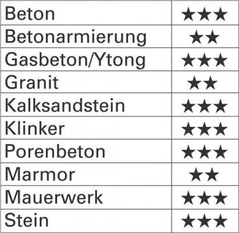 · zertifiziert durch die Prüfgemeinschaft Mauerbohrer (PGM) nach Anforderungen des Deutschen Instituts für Bautechnik (DIBt)Anwendungsbereiche: Beton, armierter Beton, Stein, Kalksandstein, Mauerwerk, Marmor und Klinker
