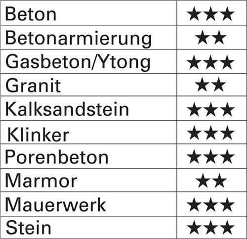 · zertifiziert durch die Prüfgemeinschaft Mauerbohrer (PGM) nach Anforderungen des Deutschen Instituts für Bautechnik (DIBt)Anwendungsbereiche: Beton, Betonarmierung, Mauerwerk, Naturstein, Kalksandstein, Fliesen, Marmor, Klinker