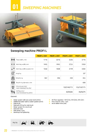 l Working area lightening l Side brush l Oil flow regulator: 150 l/min; 250 l/min; 340 l/min