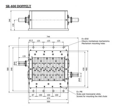 Der SR-400 DOUBLE zeichnet sich durch seine vollständig zerlegbare Struktur aus, die durch Schrauben zusammengehalten wird. Er verfügt über zwei Antriebswellen und eine Arbeitskammer mit den Maßen 400 x 415 mm. Die Arbeitswerkzeuge bestehen aus besonders verschleißfestem Stahl.