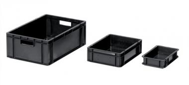 Transportstapelkasten L400xB300xH145mm PP leitfähig schwarz Wände u.BD geschl.4 St/Karton · aus leitfähigem schwarzen Polypropylen · besonders geeignet zur Lagerung und zum Transport von Elektronikbauteilen · beständig gegen die meisten Säuren und Lau| Preis pro Einheit | 4 ST | 25,71 €/ST |