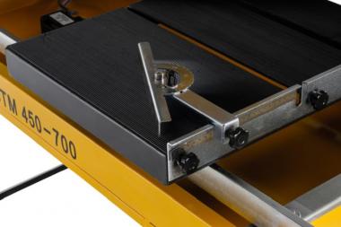 Die leichtgängige Rollentischkonstruktion ist mit einer rutschfesten Gummiauflage und einem Winkelanschlag ausgestattet, was Gehrungsschnitte bis zu einem Winkel von 45° ermöglicht. Der robuste Rahmen mit Metallwanne und wartungsfreier Tauchpumpe sorgt für effektive Kühlwasserförderung während des Schneidens.